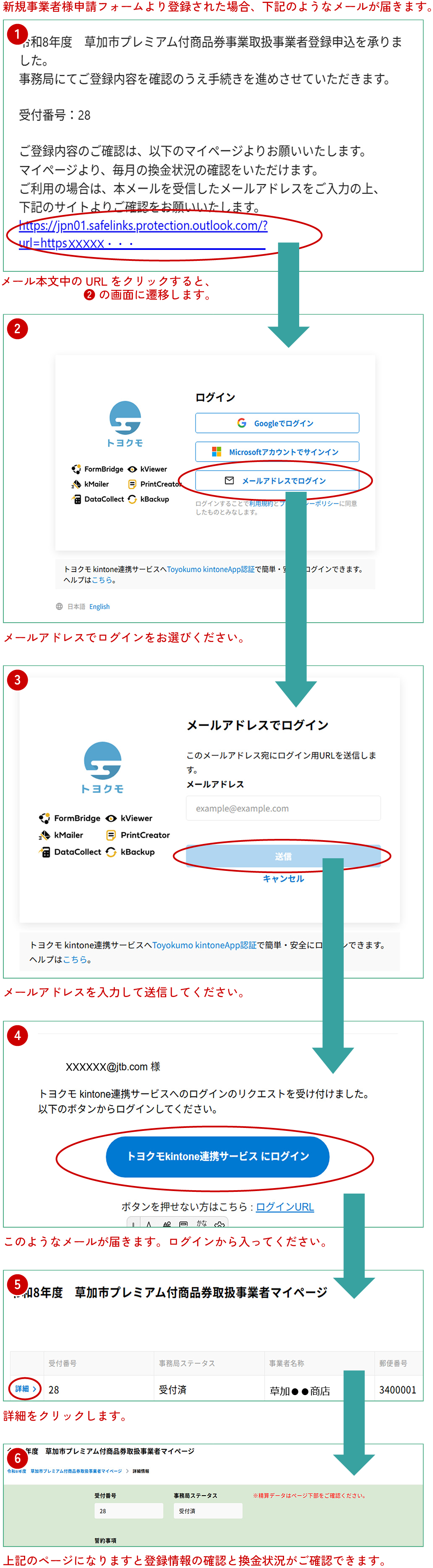 事業者マイページより登録済みのメールアドレスを入力いただくと下記のようなメールが自動送信されますので、受信されたメール本文に記載のログインURLから、登録情報の確認と換金状況を確認ください。